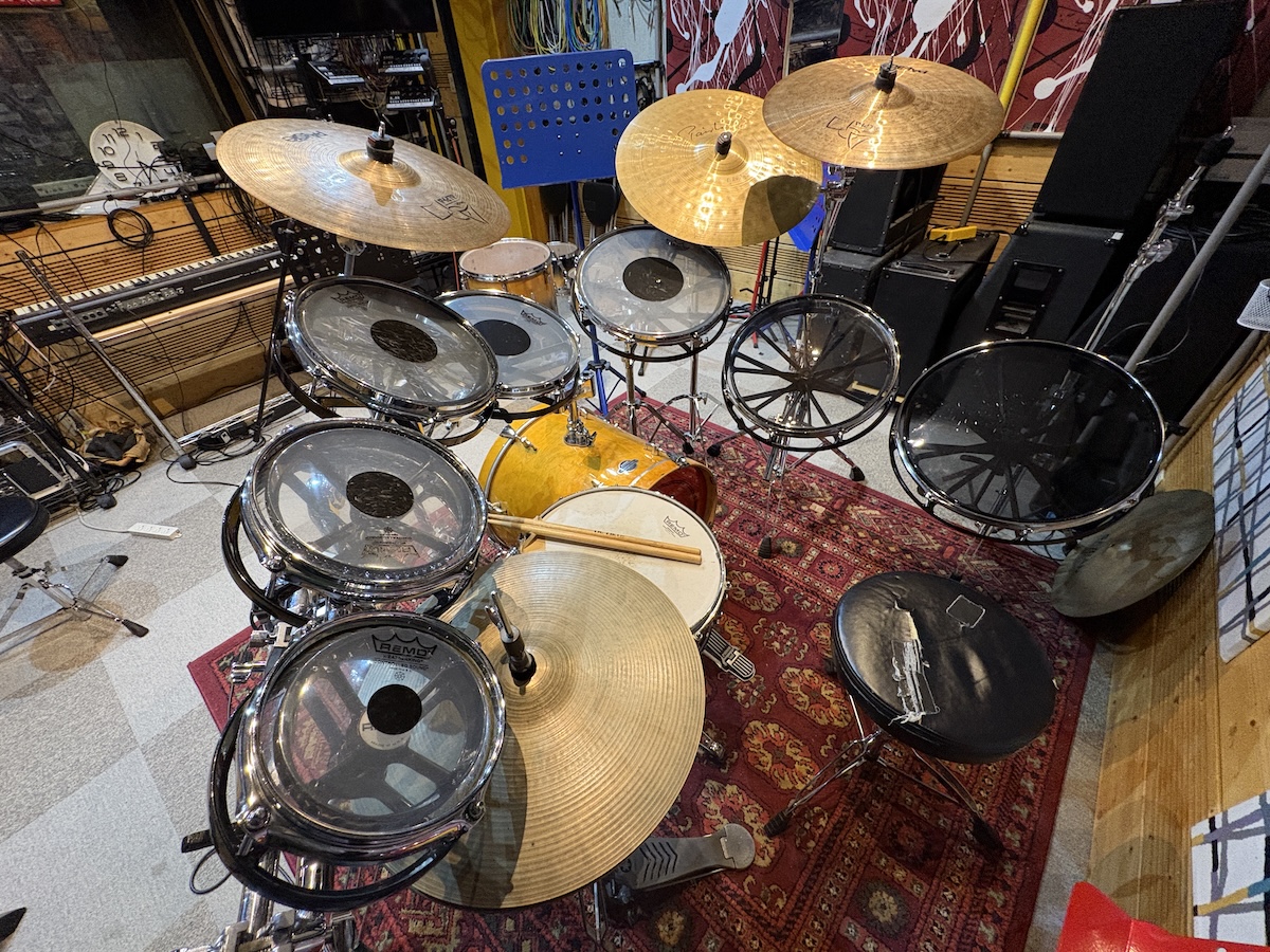 スタジオ機材を総動員したドラムセットです。セッティングはお手伝いします。セッティング時間(30分程度)も料金が発生しますのでご了承下さい。終了時は、そのままの状態でお帰りいただけます。