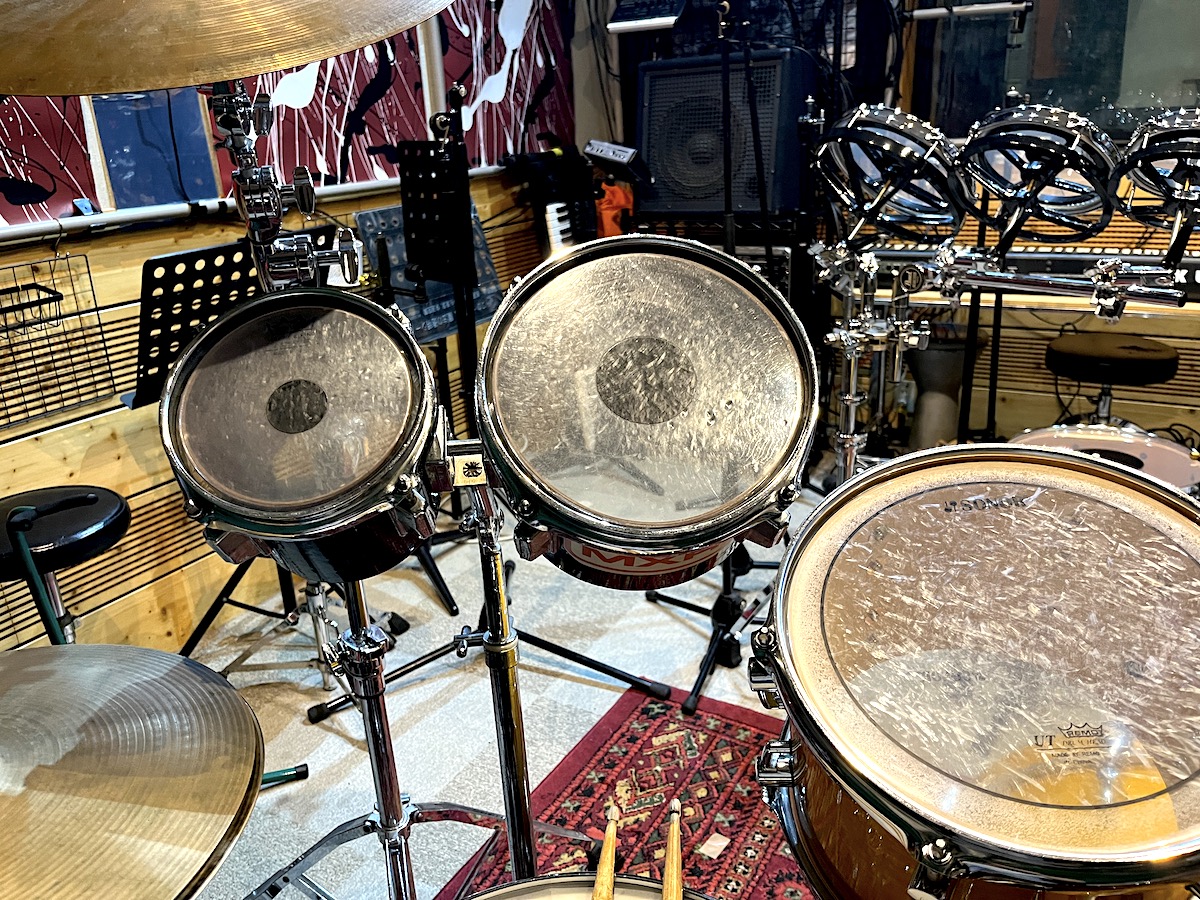 スタジオ機材を総動員したドラムセットです。セッティングはお手伝いします。セッティング時間(30分程度)も料金が発生しますのでご了承下さい。終了時は、そのままの状態でお帰りいただけます。